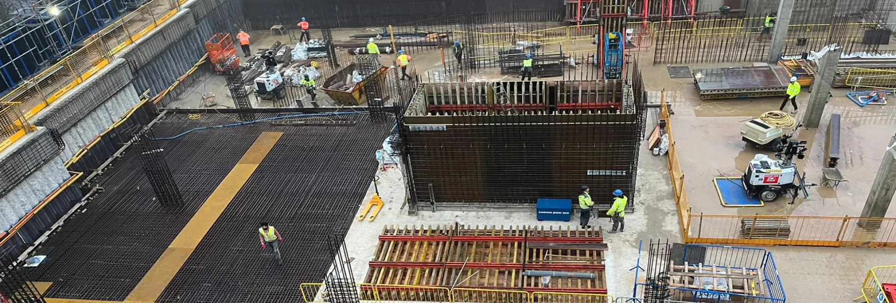 A full groundworks and RC frame package for a landmark five-storey Cambridge office, featuring a waterproof concrete basement and a carefully managed transition between concrete, steel and glulam at first floor.