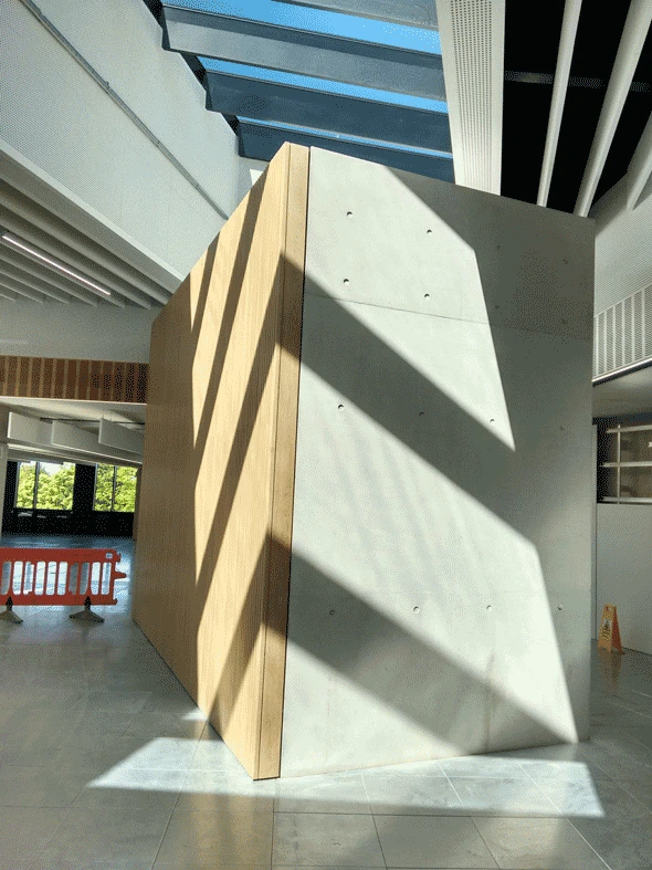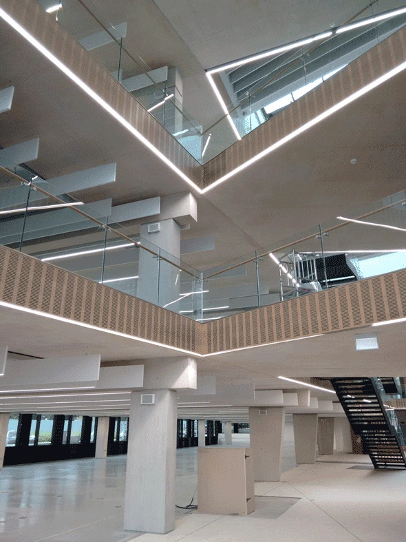 The structure features post-tensioned slabs and beams with embedded cooling pipes, and a high proportion of the frame carries a quality architectural concrete finish across columns, walls and soffits.